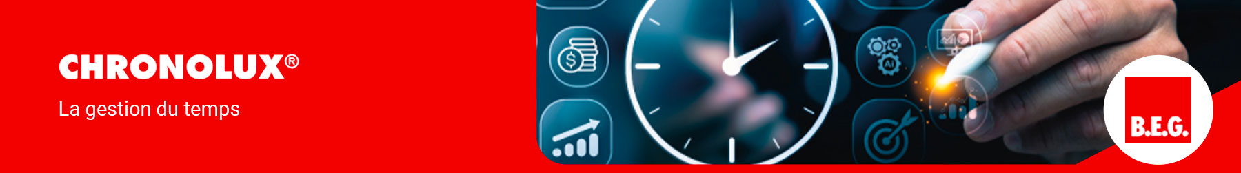 La gamme CHRONOLUX de B.E.G. propose des solutions avancées de programmation horaire, offrant un contrôle précis de l’éclairage, du chauffage et des autres équipements électriques. Les horloges CHRONOLUX numériques ou digitales optimisent la gestion de l’énergie tout en garantissant un confort optimal aux utilisateurs.